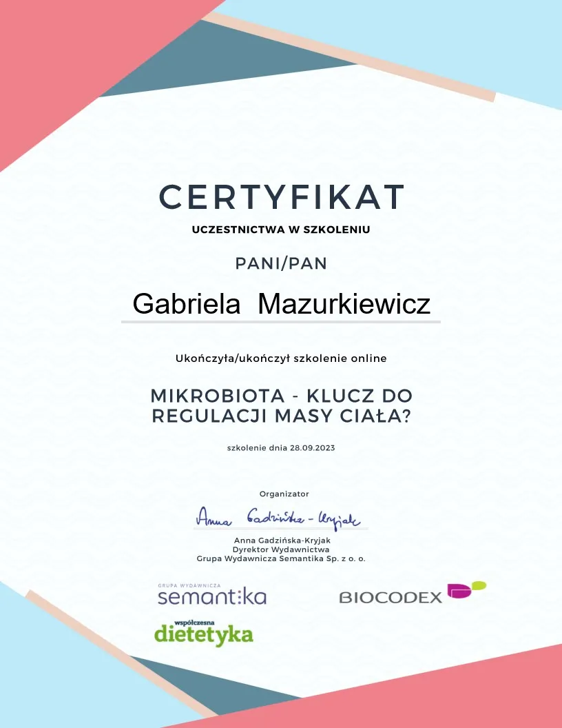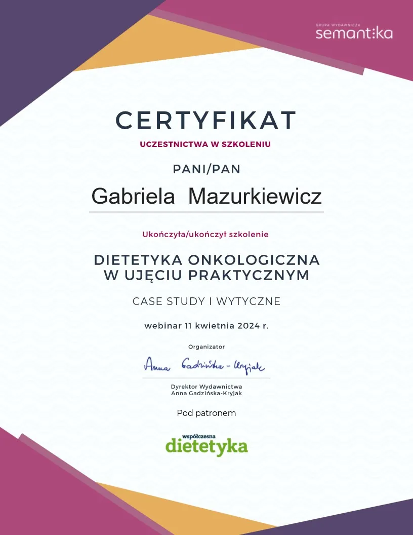 Nieustannie podnoszę swoje kwalifikacje i poszerzam wiedzę poprzez aktywne uczestnictwo w licznych kursach oraz szkoleniach z zakresu dietetyki klinicznej. Stawiam na ciągłe doskonalenie się i śledzenie najnowszych osiągnięć naukowych oraz praktycznych rozwiązań w dziedzinie żywienia i suplementacji, aby zapewnić moim podopiecznym współpracę na najwyższym poziomie.